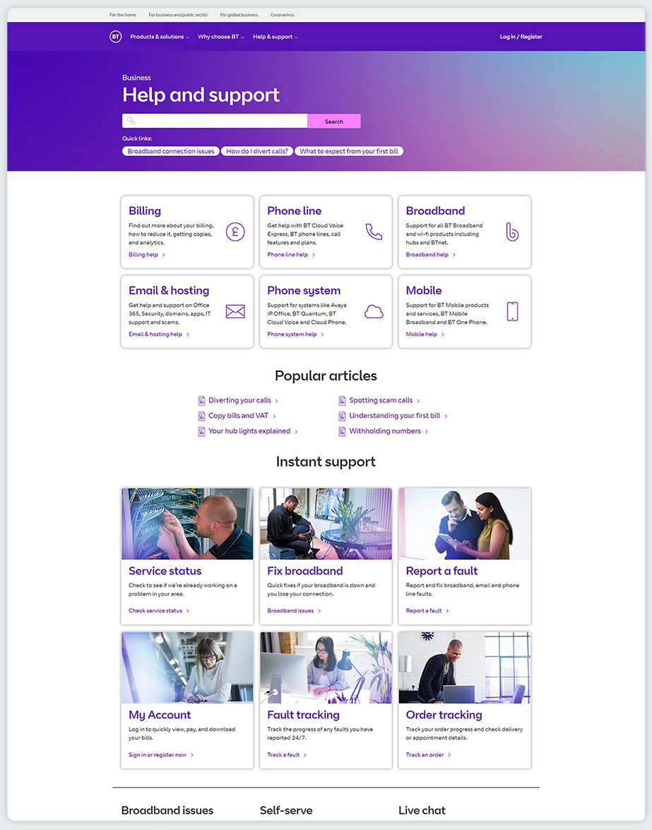 BT Business has been in the process of undergoing a B2B design system-update with the vision of improving the overall usability. Many existing formats required an update in style and were to be re-thought and modernized. The goal within the help & support section was to research current design choices, re-use where possible and update to the most recent design standards where necessary.